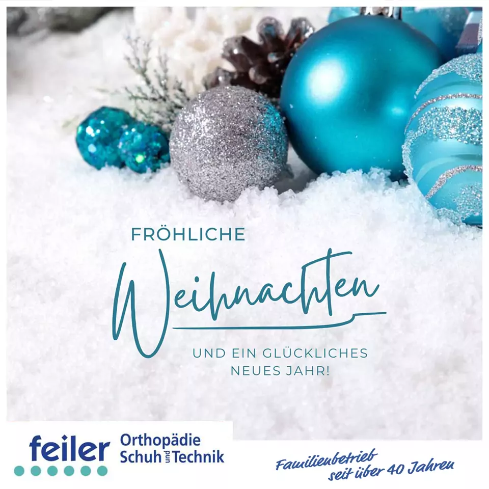 Liebe Kunden und Geschäftspartner, das Team von Orthopädie Feiler bedankt sich für Ihre Treue und wünscht Ihnen und Ihren Familien fröhliche Weihnachten und ein glückliches und gesundes Neues Jahr 2025.  Am 07.01.2025 sind wir wieder, wie gewohnt, für Sie da.